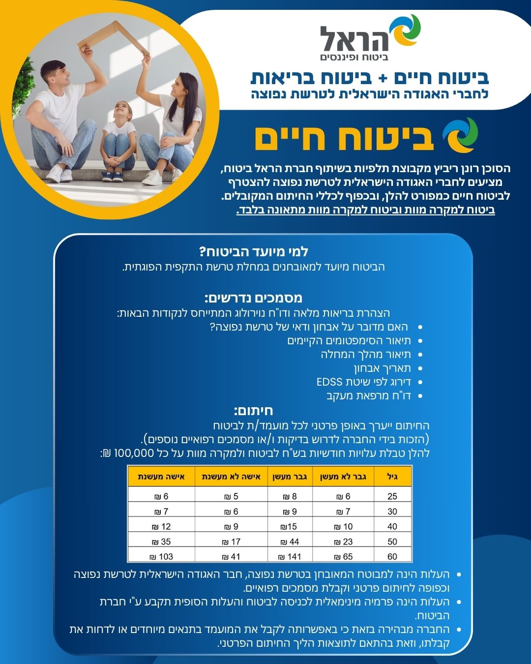 הסוכן רונן ריביץ מקבוצת תלפיות בשיתוף חברת הראל ביטוח, מציעים לחברי האגודה הישראלית לטרשת נפוצה להצטרף לביטוח חיים כמפורט להלן, ובכפוף לכללי החיתום המקובלים.