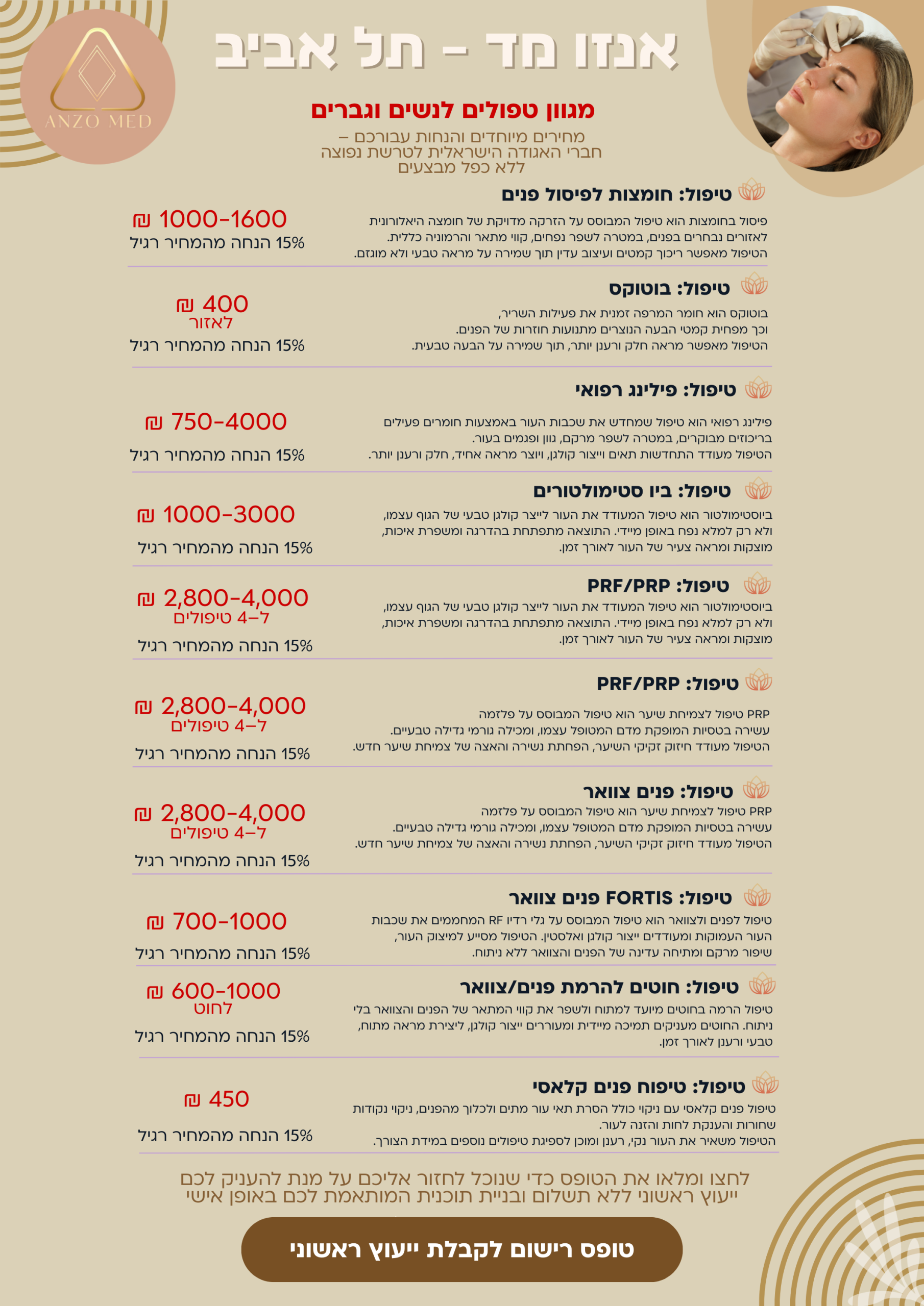באנזו מד מתמחים בטיפול פנים לא פולשני, הזרקות מדויקות, טיפולי לייזר, RF, חוטים, עיצוב גוף, טיפולי PRP-PRF לשיער ועוד – כל זאת תוך התאמה אישית לכל לקוחה ולקוח, בליווי רפואי מקצועי, יחס אישי ותשומת לב לפרטים הקטנים.