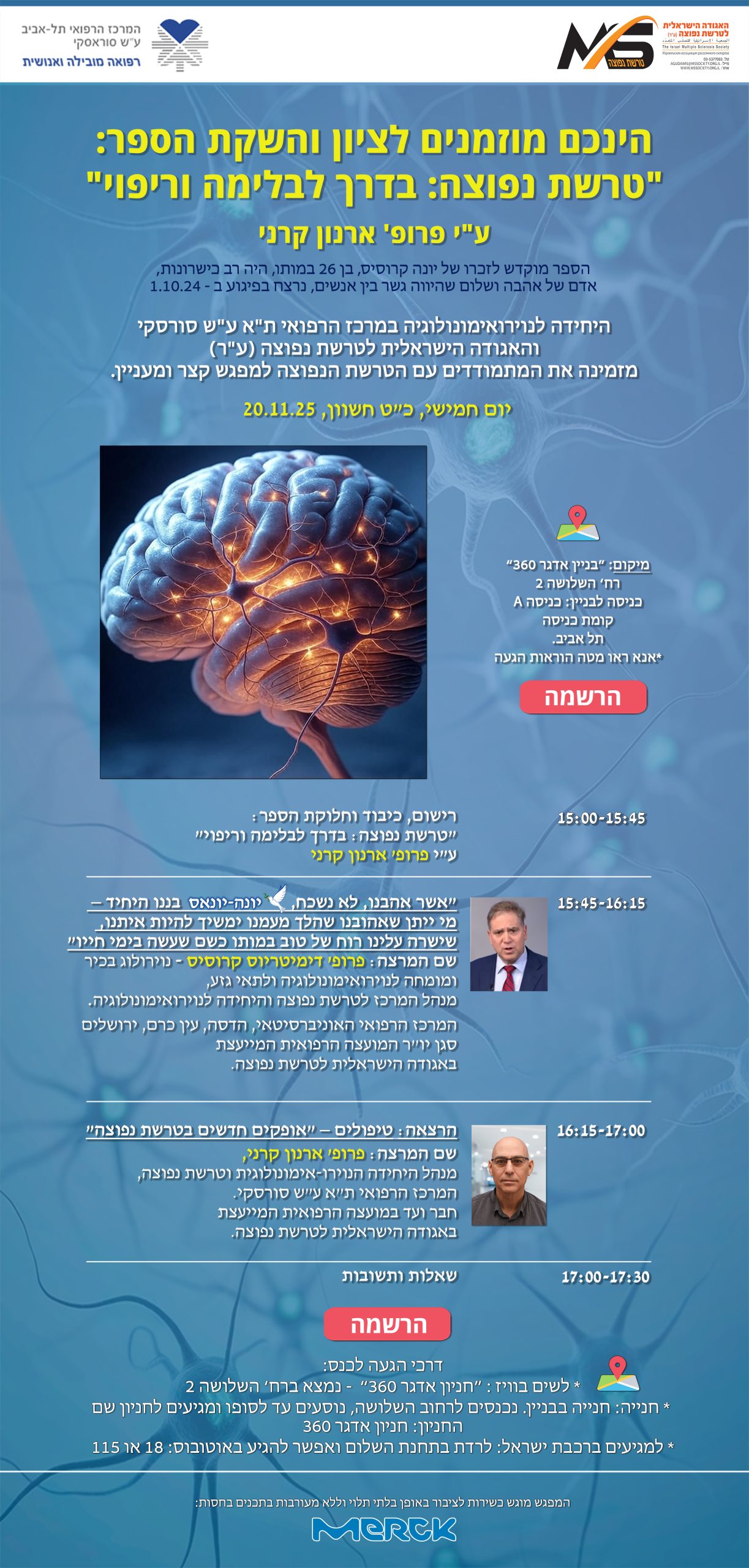 הינכם מוזמנים לציון והשקת הספר: "טרשת נפוצה: בדרך לבלימה וריפוי" ע"י פרופ' ארנון קרני – היחידה לנוירואימונולוגיה במרכז הרפואי ת"א ע"ש סורסקי והאגודה הישראלית לטרשת נפוצה (ע"ר) מזמינה את המתמודדים עם הטרשת הנפוצה למפגש קצר ומעניין – יום חמישי כ"ט חשוון – 20.11.25 – המפגש מוגש כשירות לציבור באופן בלתי תלוי וללא מעורבות בתכנים בחסות חב' מרק
