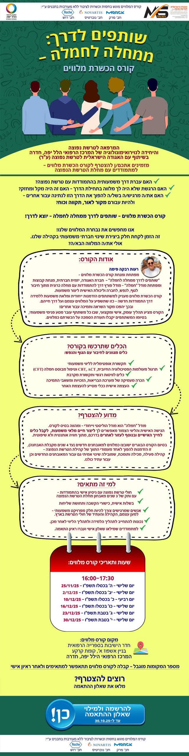 ראשי » פעילויות האגודה לרווחת חולי הטרשת הנפוצה » סדנאות » “שותפים לדרך: ממחלה לחמלה” – קורס הכשרת מלווים – המרפאה לטרשת נפוצה והיחידה לנוירואימונולוגיה של המרכז הרפואי הלל יפה, חדרה בשיתוף עם האגודה הישראלית לטרשת נפוצה (ע”ר) מזמינים אתכם/ן להצטרף לקורס הכשרת מלווים – למתמודדים עם מחלת הטרשת הנפוצה