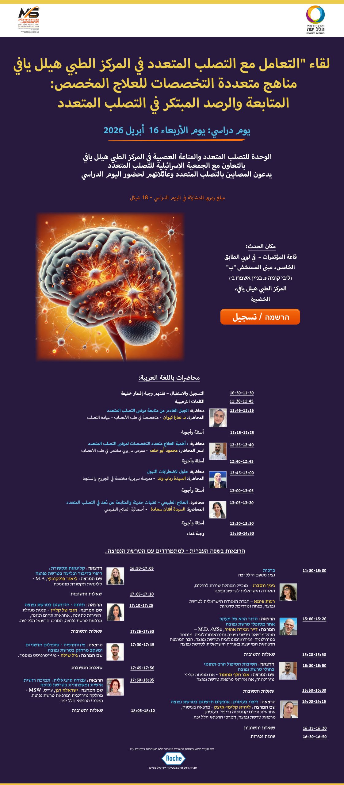 لقاء “التعامل مع التصلب المتعدد في المركز الطبي هيلل يافي مناهج متعددة التخصصات للعلاج المخصص: المتابعة والرصد المبتكر في التصلب المتعدد – يوم دراسي: يوم الأربعاء 16 أبريل 2026